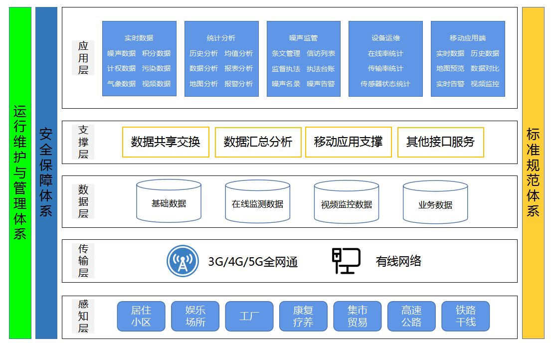 (3)應用層:旨在建設一套(tào)服務於當地環境監管部門和周圍社(shè)會公眾的智能監管(guǎn)保障體係。平台實現噪聲(shēng)汙染源在線監測數據共享與對接,信息管理,預警報(bào)警,大數據一張圖等功能,並配備移(yí)動(dòng)APP方便用(yòng)戶隨時隨地(dì)查看當地監測點位情況、提(tí)供設(shè)備運維功能、提供相關執法部門現場執法(fǎ)等功能。