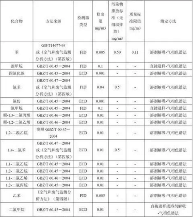 我國對環境空氣中揮發性有機物監測分析方法以吸(xī)附劑采樣,溶劑洗(xǐ)脫、氣相色譜分析(xī)為主,大都以單個組分分析,檢出限較高。國內相關監測分(fèn)析方法見下表。
