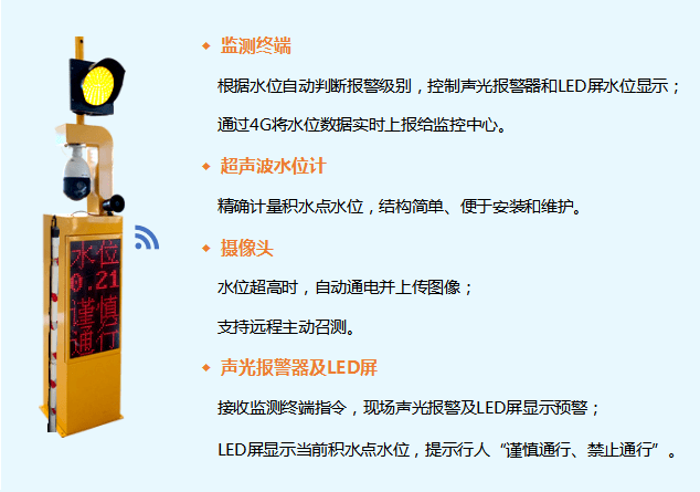 ◆ 集水位、視(shì)頻數據監測、采集、上傳,LED屏提示、聲光報警等功能於一體(tǐ)